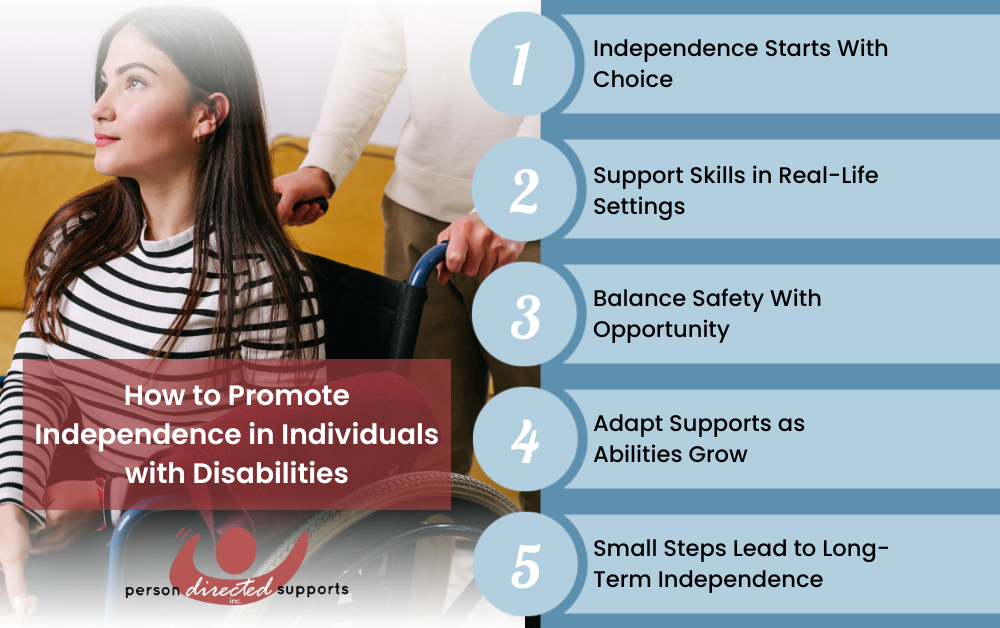 Promoting independence is not a one-size-fits-all effort, and it is never a finished task. To promote independence in individuals with disabilities, families, caregivers, and support professionals must commit to an ongoing process built on trust, flexibility, and respect for individual choice. Independence grows when people are given opportunities to build skills, make decisions, and participate in daily life with supports that adapt as needs and abilities change.